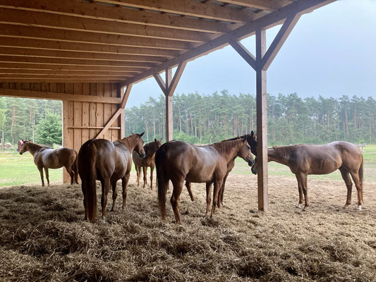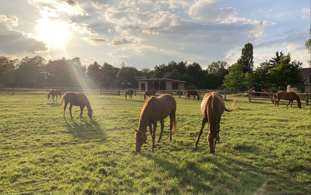 Von der Lebensphilosophie des Stalls profitieren jedoch nicht nur meine eigenen Pferde, sondern gleichermaßen auch Pferde, die vorübergehend ihren Weg zu mir finden. Sei es zur Rekonvaleszenz, zur Aufzucht als Jungpferd oder zur Vermittlung, um nach der Zeit im Galopprennsport in einen neuen Lebensabschnitt als Freizeitpartner zu starten. Bei der Versorgung aller Pferde arbeite ich eng mit einem Netzwerk aus erfahrenen Tierärzten, Hufschmieden, Futtermittellieferanten usw. zusammen, um den Pferden die bestmöglichste Betreuung zukommen zu lassen.